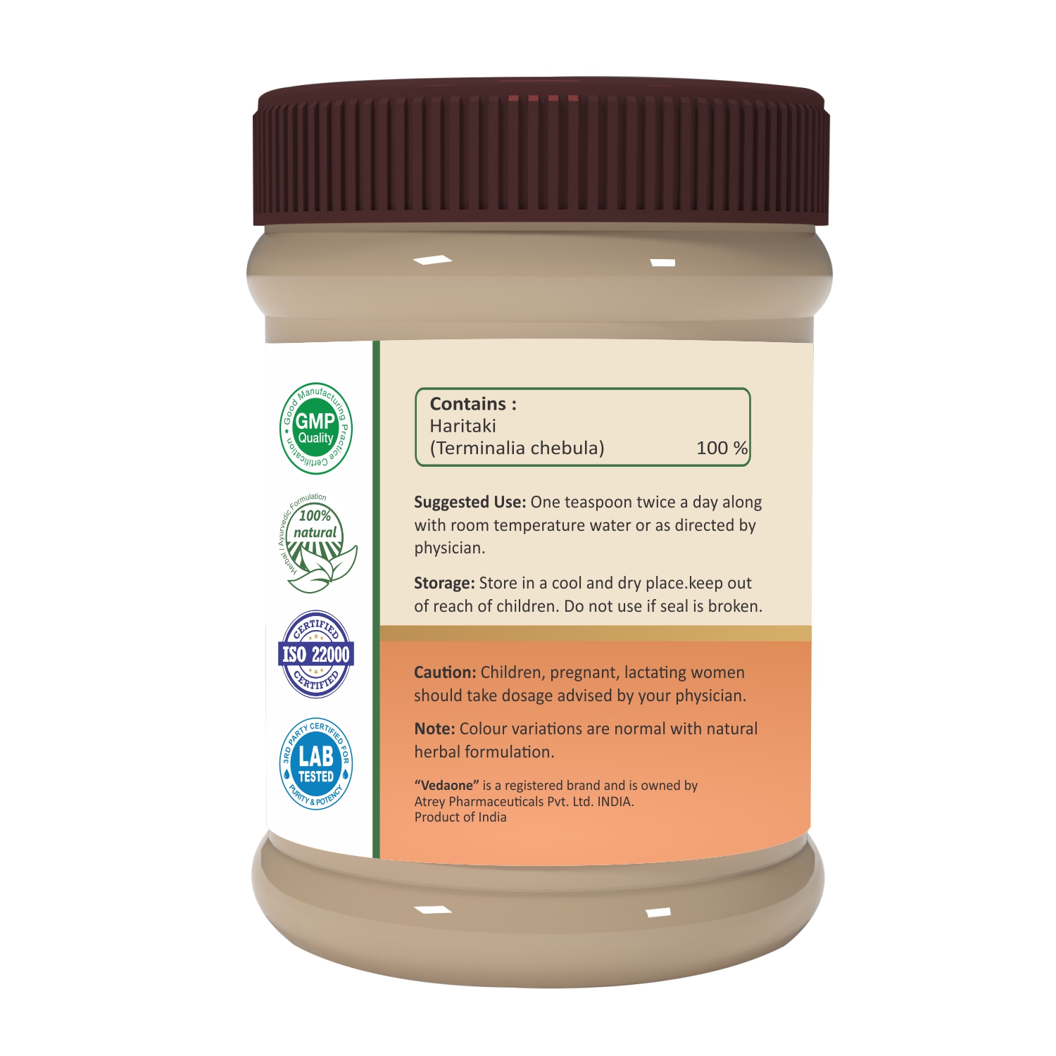 Vedaone Harde Powder is a wellness supplement prepared from Harde (Terminalia chebula) fruit, traditionally valued in Ayurveda for its cleansing and rejuvenating properties. Harde is a natural source of Tannins (such as chebulagic acid, chebulinic acid, gallic acid, and ellagic acid), flavonoids, and phenolic compounds.