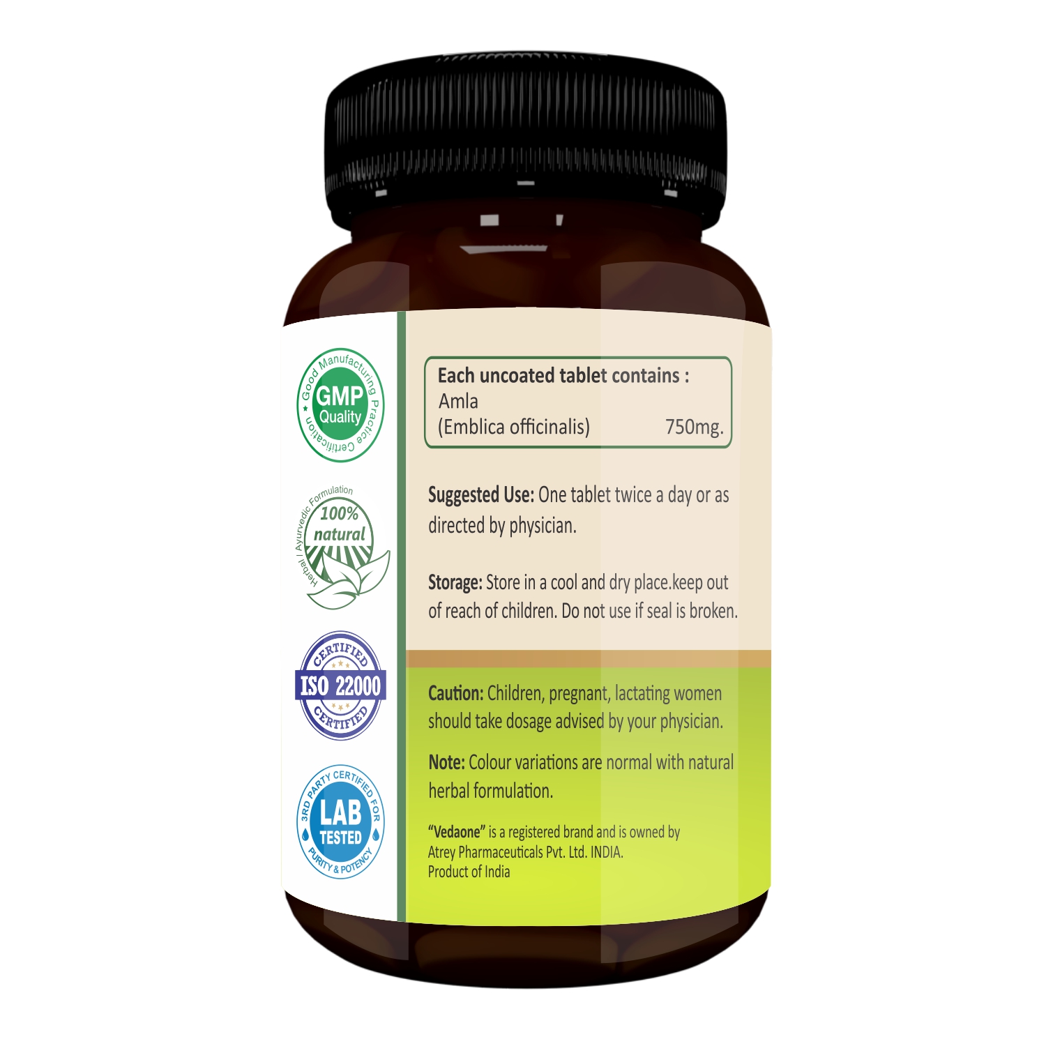 Vedaone Amla Tablet is a wellness supplement formulated with Amla (Emblica officinalis) fruit powder, traditionally valued in Ayurveda for its revitalizing and antioxidant properties. Amla is a natural source of Vitamin C, polyphenols, tannins, and flavonoids.