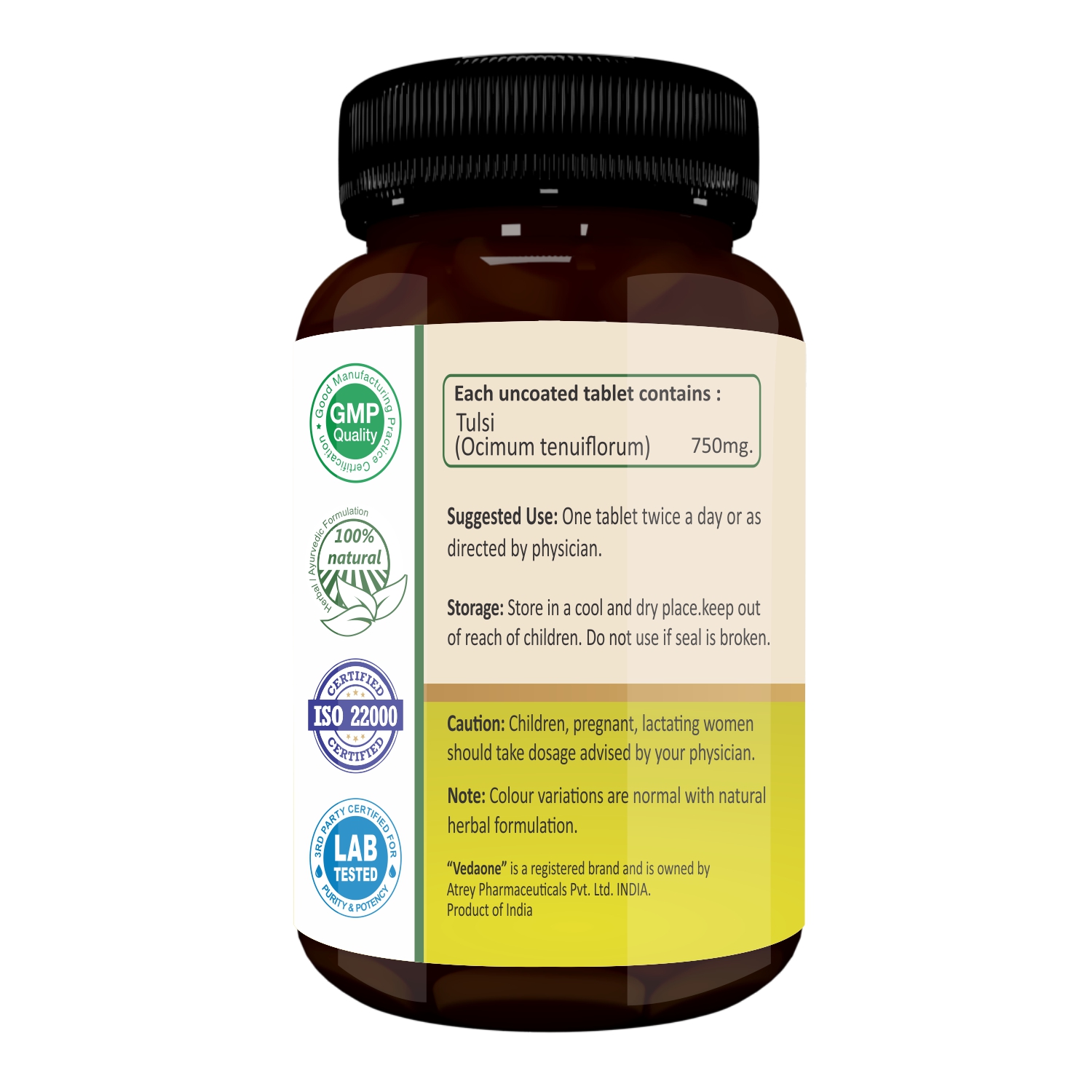Vedaone Tulsi Tablet is a wellness supplement formulated with Tulsi (Ocimum tenuiflorum) leaf powder, traditionally valued in Ayurveda for its adaptogenic and balancing properties. Tulsi is a natural source of essential oils, flavonoids, triterpenoids and phenolic compounds.