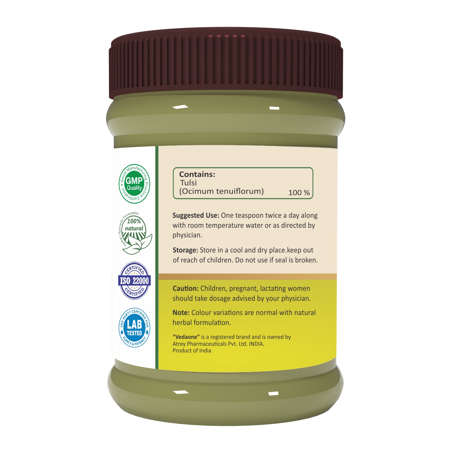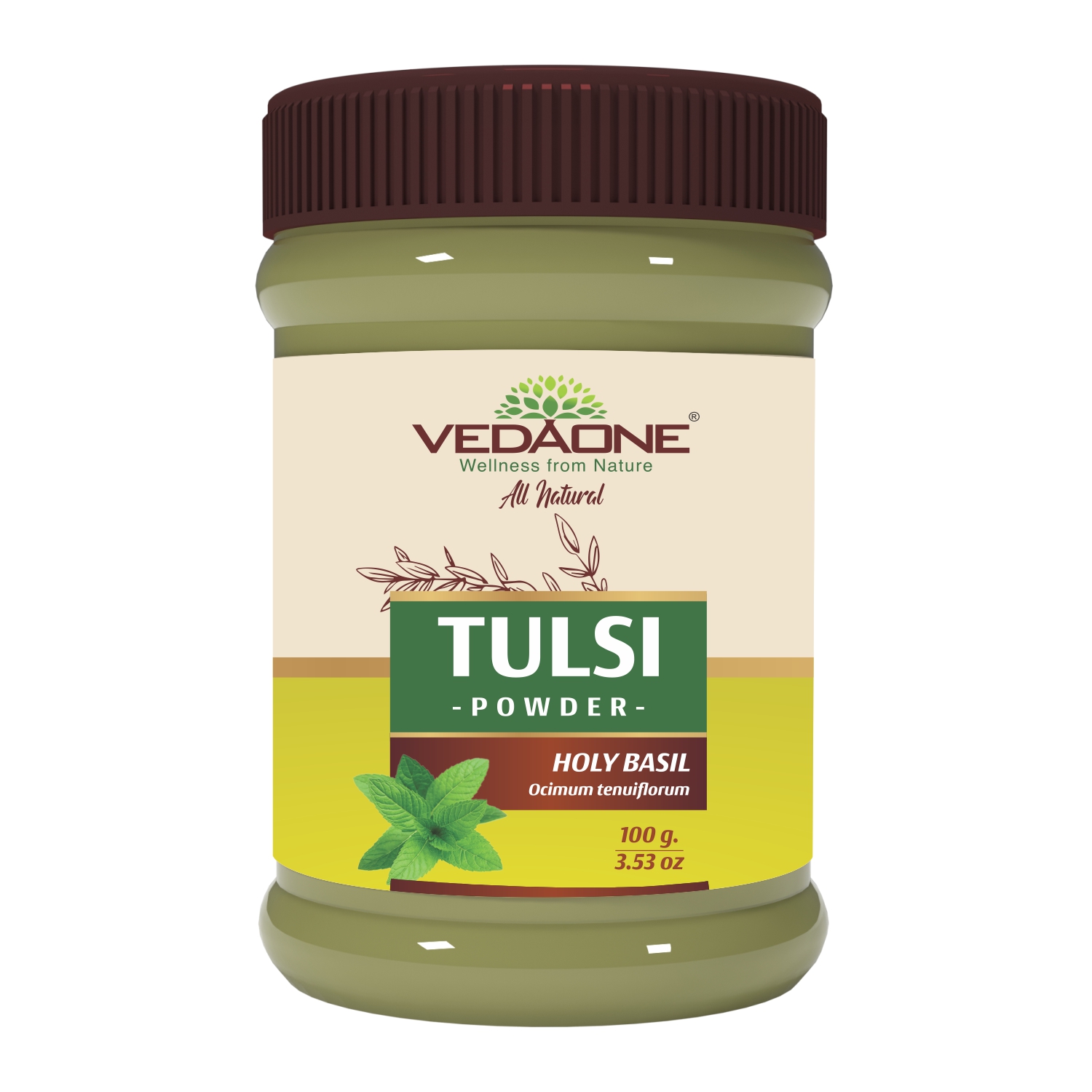 Vedaone Tulsi Powder is a wellness supplement prepared from Tulsi (Ocimum tenuiflorum) leaf, traditionally valued in Ayurveda for its adaptogenic and balancing properties. Tulsi is a natural source of essential oils, flavonoids, triterpenoids and phenolic compounds.