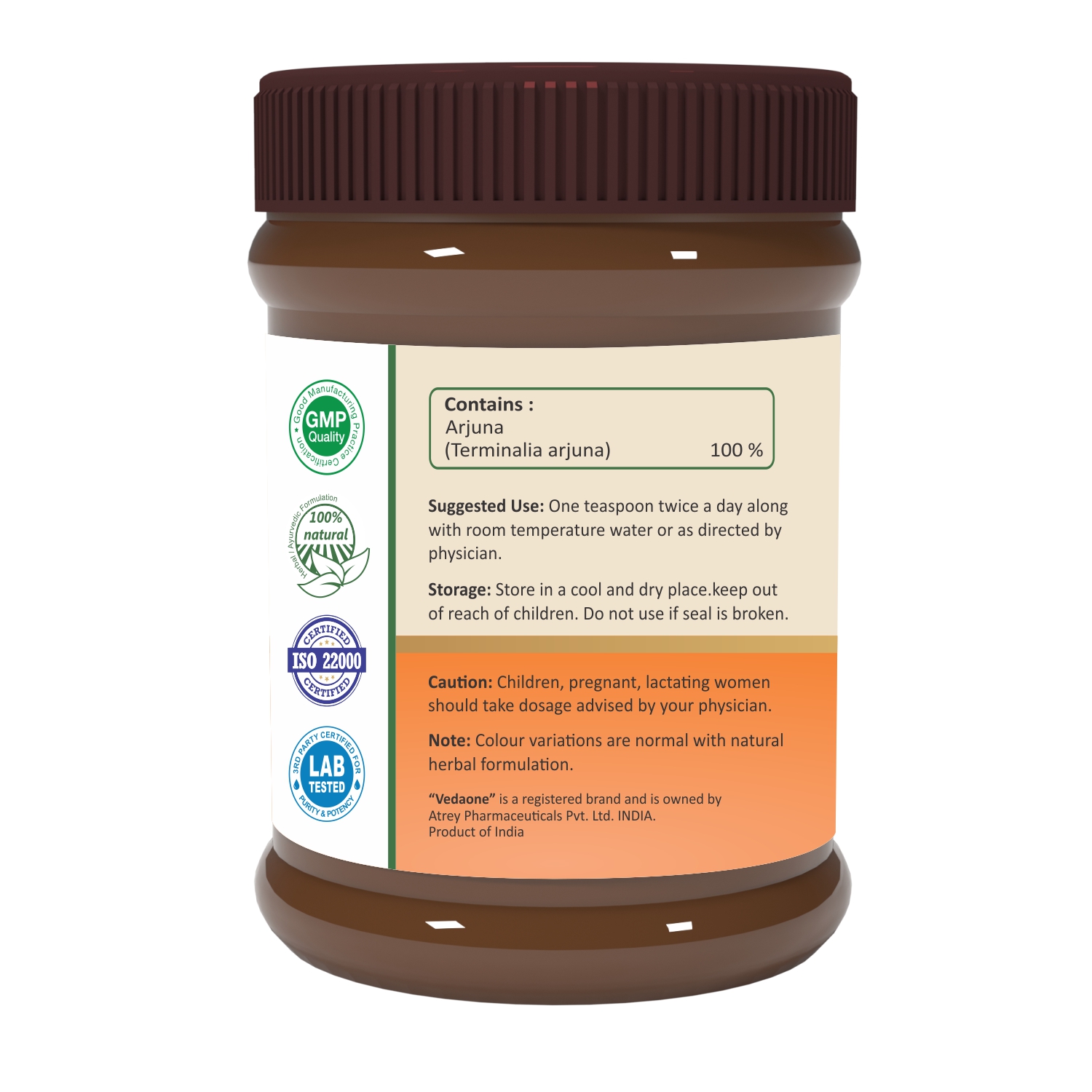 Vedaone Arjuna Powder is a wellness supplement made from the bark of Arjuna (Terminalia arjuna), traditionally valued in Ayurveda for its strengthening and rejuvenating properties. It is a natural source of bioactive compounds such as arjunolic acid, flavonoids, tannins, saponins, and glycosides, along with essential minerals like calcium, magnesium, zinc, and copper.